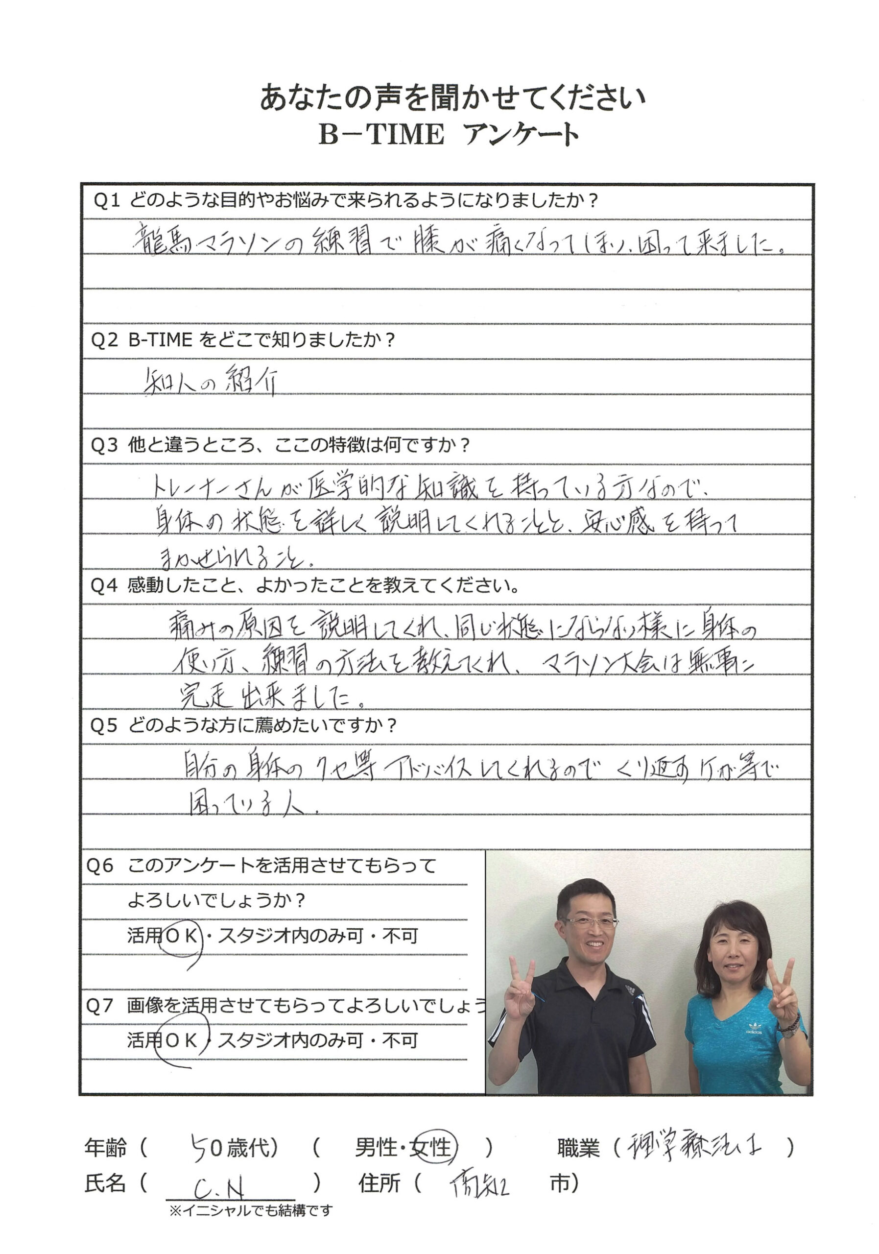 痛みの原因を説明してくれ、同じ状態にならない様に身体の使い方、練習の方法を教えてくれ、マラソン大会は無事に完走出来ました。